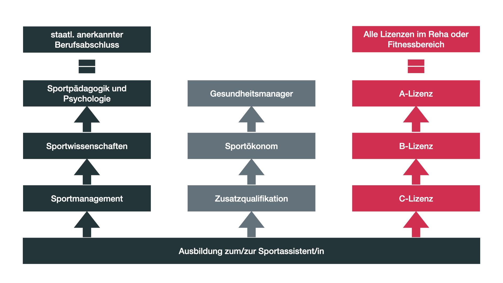 Außerdem kannst Du Dich während der Ausbildung zusatzqualifizieren, indem Du unter Anleitung unseres Lehrerteams eine Facharbeit verfasst. Nach erfolgreichem Bestehen darfst Du die Berufsbezeichnung Sportökonom oder Gesundheitsmanager tragen. Und weil das noch nicht genug ist, erwirbst Du während der Ausbildung die höchsten Lizenzen der Gesundheitsbranche.